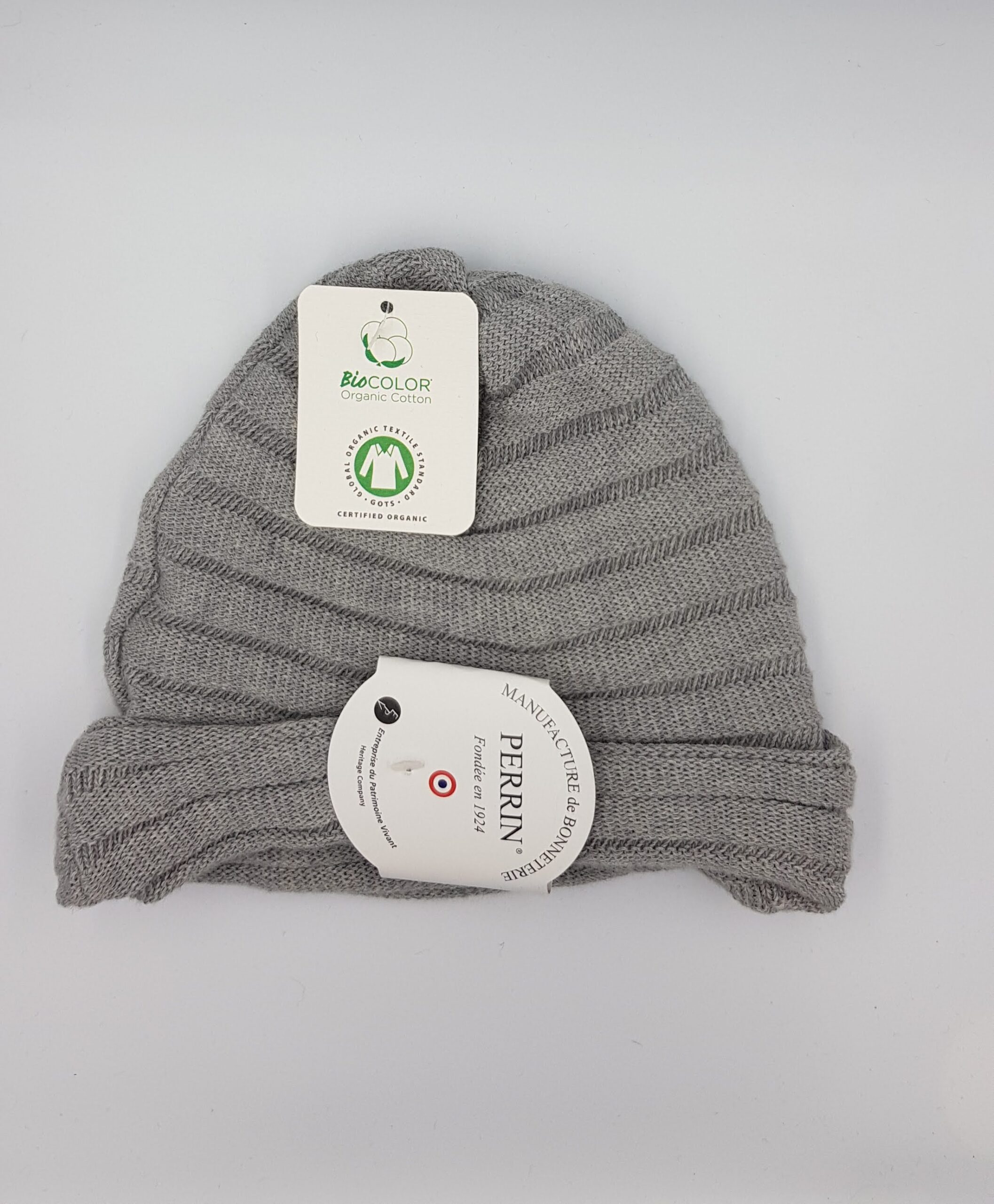 Bonnet en pur coton hypoallergénique bio gris clair ,taille unique, manufacture Perrin fabriqué en France.